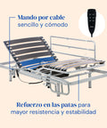 Letto elettrico: Rete elettrica con struttura in acciaio rinforzato e doghe larghe in legno per un supporto sicuro. Si regola facilmente con telecomando cablato, permettendo di articolare schienale e gambe con totale comodità. Compatibile con accessori opzionali.