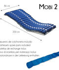 Questo materasso antidecubito con compressore, modello Mobi 2 di colore blu, è indicato per la prevenzione di ulcere da pressione di fase II in pazienti che trascorrono lunghi periodi a letto. La prevenzione delle ulcere da pressione o escare include anche una buona cura della pelle, una nutrizione ottimale, l'adozione di una postura corretta e l'uso di prodotti antidecubito.