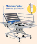 Cuida sin castigar tu espalda. Eleva la cama articulada con carro elevador hasta los 82,5 cm para asistir a la altura de tu cintura, evitando posturas forzadas. El nivel mínimo de 39 cm asegura transferencias laterales más livianas y seguras para ambos.